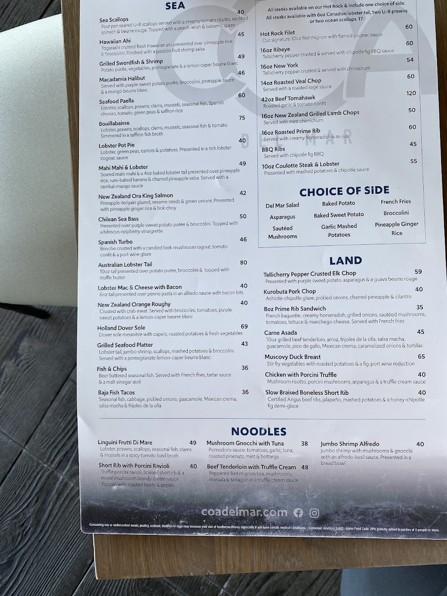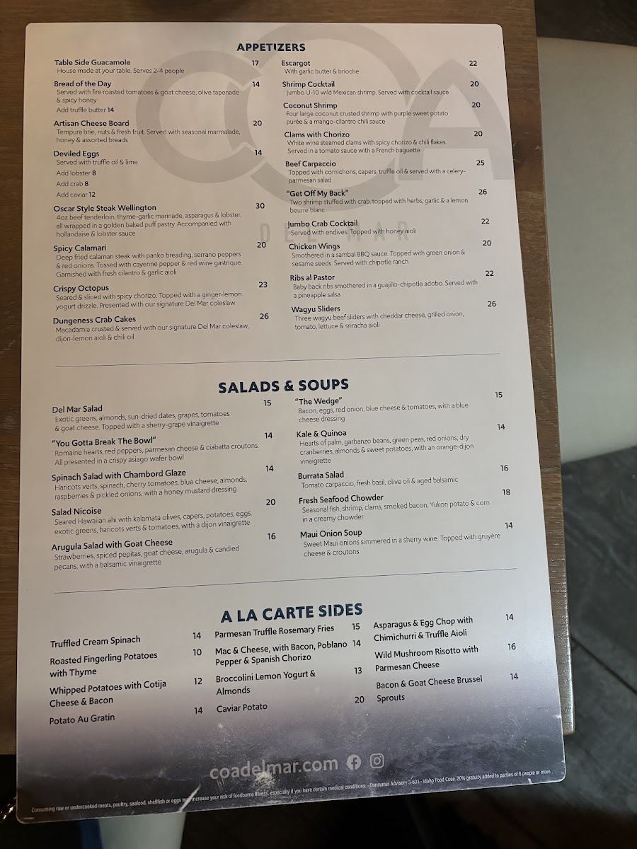 Welcome to Coa Del Mar, Eagle's culinary gem nestled right by the lakeside at 2121 E Riverside Dr. This enchanting restaurant seamlessly blends unparalleled coastal flavors with an inviting atmosphere that will take you away from the everyday hustle. The star of the menu includes tantalizing entrees like Linguini Frutti Di Mare and Macadamia Halibut, alongside hearty options such as the 16oz Roasted Prime Rib and Hot Rock Filet.